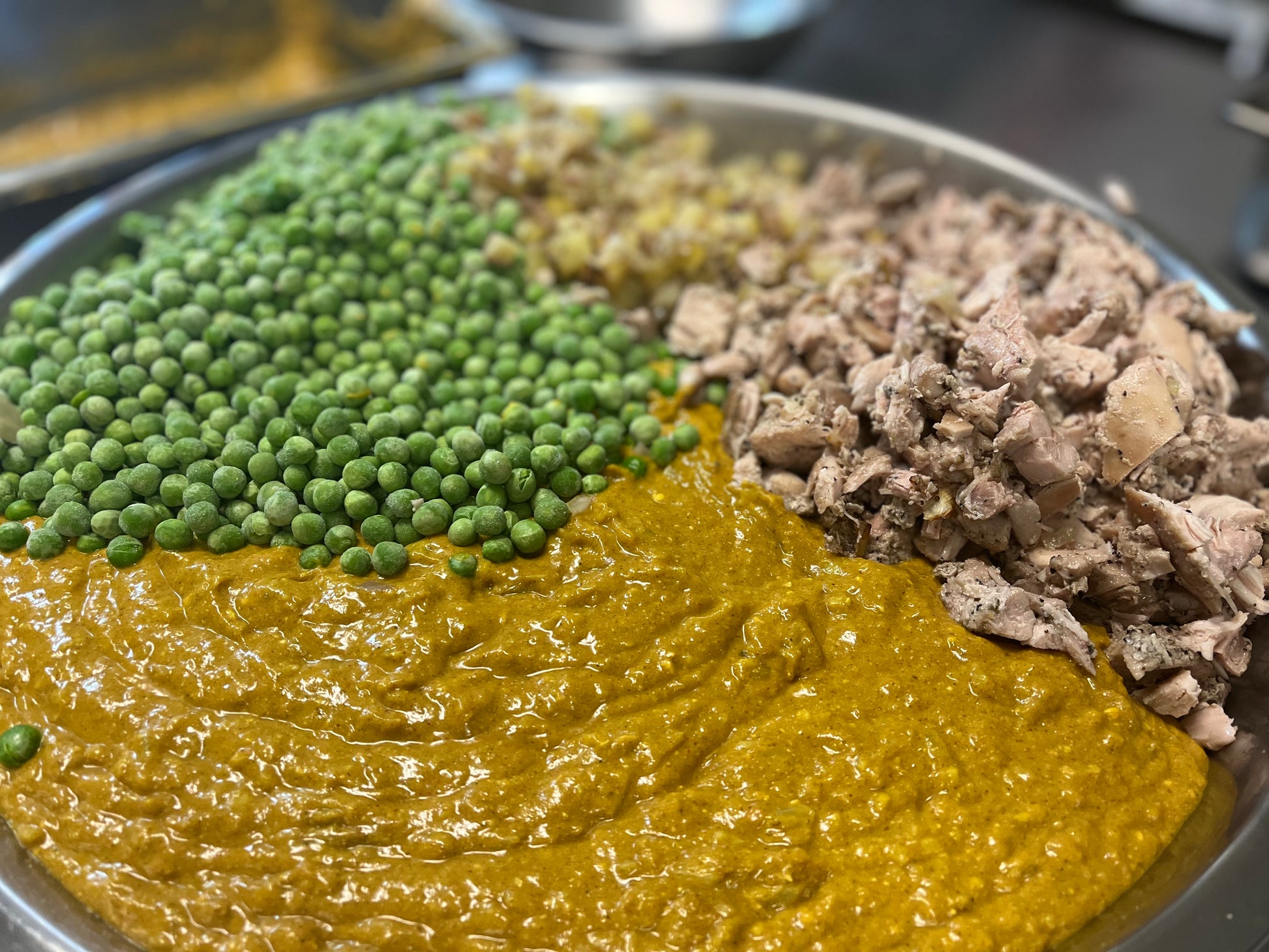 Ingredients: Chicken, Potatoes, Peas, Onion, Yogurt, Coconut Milk, Tomato Paste, Lemon Juice, Cornstarch, Salt, Pepper, Spices.