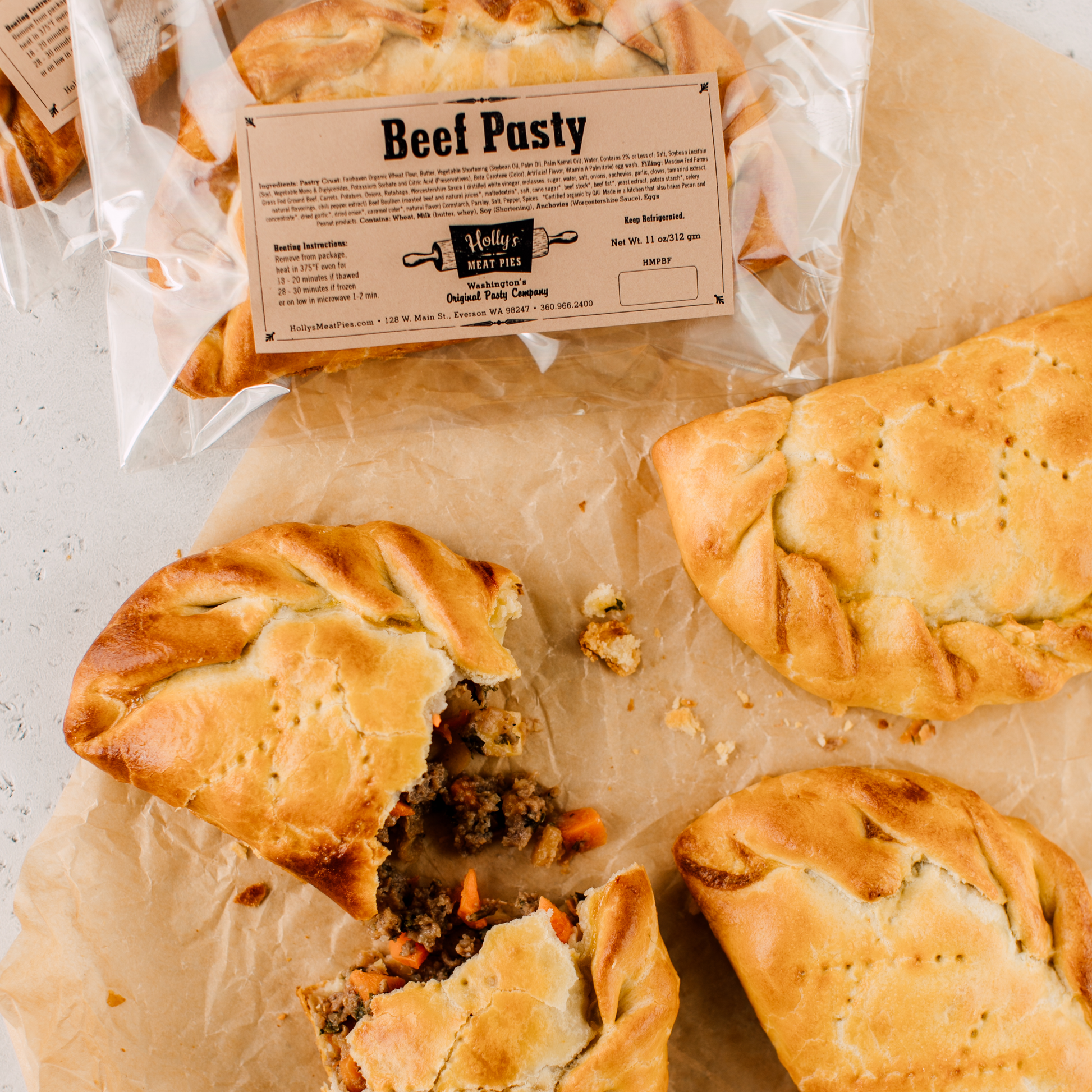 Holly’s signature Beef Pasty, made in the Cornish pasty style, is the cornerstone of our business. We use local grass-fed ground beef, organic potatoes, organic carrots, and organic rutabaga (to make it authentic), all wrapped into our flaky pastry made from organic Fairhaven Flour Mill flour. You don’t have to work in the mines to enjoy this hearty meal!