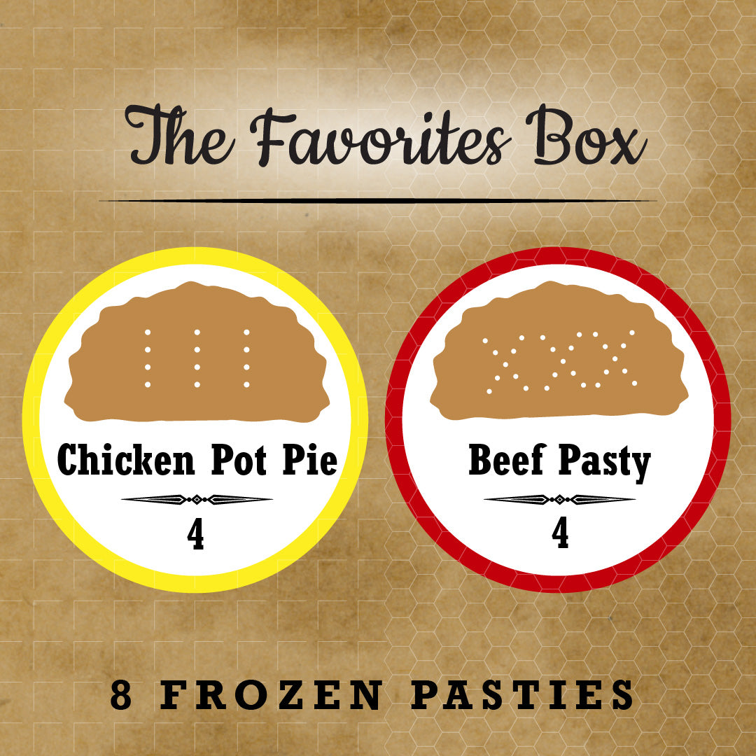 The Favorites Box contains 4 Beef Pasties and 4 Chicken Pot Pie Pasties delivered straight to your door. Sustainably-sourced packaging and dry ice keep pasties frozen upon delivery. Frozen pasties stay fresh in the freezer for up to 5 months.